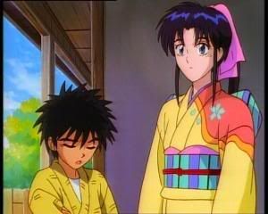 A la siguiente tarde, Hiko pasa de nuevo por el lugar de la matanza y se da cuenta de que hay muchas cruces, como en un cementerio, all� me encuentra de nuevo con 3 rocas frente a mi. Hiko me pregunta el porqu� de tantas tumbas (las de su "familia" y las de los bandidos). Entonces, le conte ,mi historia: que comienza un a�o antes con la muerte de mi familia a causa del C�lera, al marchar de mi aldea, me encontre con esta caravana y viaje con ellos durante un a�o. Al final, razonando el por qu� de haberles dado entierro diciendo m�s o menos que las personas, ya sean bandidos o tratantes, al final cuando mueren todas quedan en silencio. Hiko, apiad�ndose tambi�n, vierte sake sobre las 3 piedras que representaban a las 3 hermanas. Tras la ofrenda, Hiko me pregunta c�mo me llamaba a lo que yo le respondi Shinta, al oir este nombre, Hiko me dice que es un nombre muy tierno, pero que para un espadachin no sirve y que desde ese momento me llamar�a Kenshin (Coraz�n De Espada) y me ofrece un regalo muy preciado, una espada. As� es como yo conoci� a mi maestro en el estilo Hiten Mitsurugi Ryu.